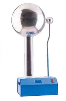 Generador electroestático que puede producir hasta 200,000 volts. Se pueden realizar varios experimentos de electroestática, siendo el más espectacular la demostración de un arco eléctrico.