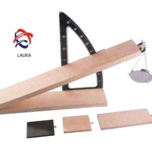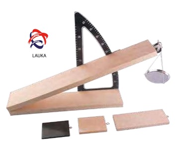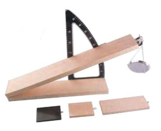 Base y plano en madera; rodillo de fricción y laminillas de peso; escala para medir alturas y ángulos de inclinación de manera directa.